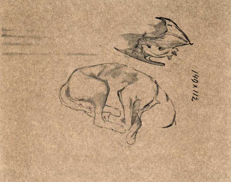 Т.Г.Шевченко. Кажан, собака. Начерки. Тонований папір, олівець (11,2 × 14 см). [Новопетровське укріплення]. [1856]. Державний музей Т. Г. Шевченка АН УРСР, Київ, інв. № г – 584.