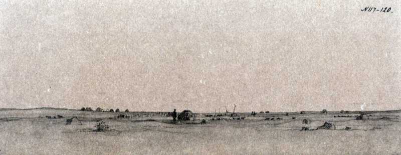 Т.Г.Шевченко. Казахське кочовище. Тонований папір, олівець (11,3 × 28,3 см). [Новопетровське укріплення]. [1856]. Державний музей Т. Г. Шевченка АН УРСР, Київ, інв. № г – 599.