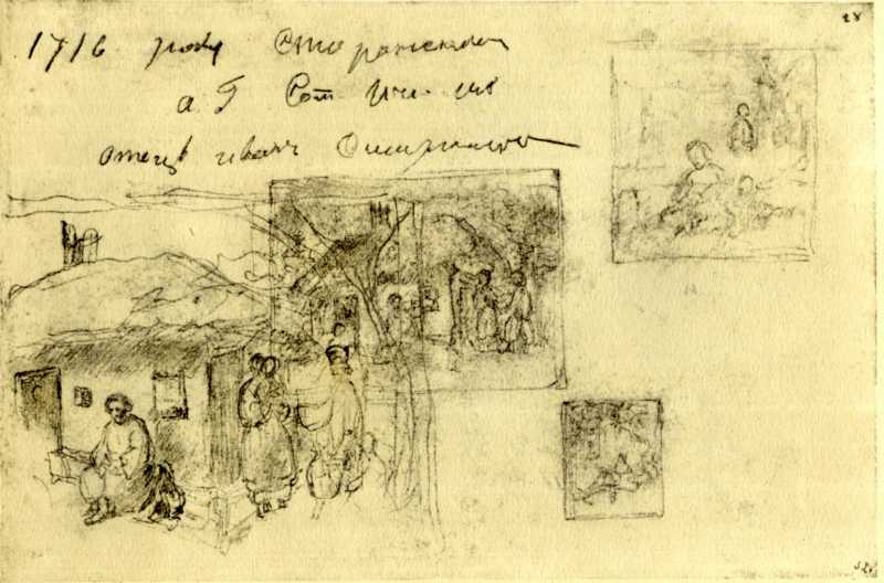 Зліва два начерки ескізів до картини Т. Г. Шевченка 1843 р. «Селянська родина». Справа два ледве накреслені начерки ескізів, дуже близьких до малюнка Т. Г. Шевченка, датованого 1843 р., — «Сліпий» («Невольник»).