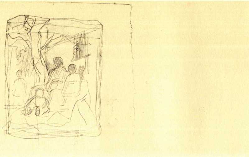 Т.Г.Шевченко. Родина біля будинку. Начерк ескіза. Олівець. [1846 – IV 1850]. Зворот аркуша між стор. 20 – 21 альбому 1846 – 1850 рр. № 109