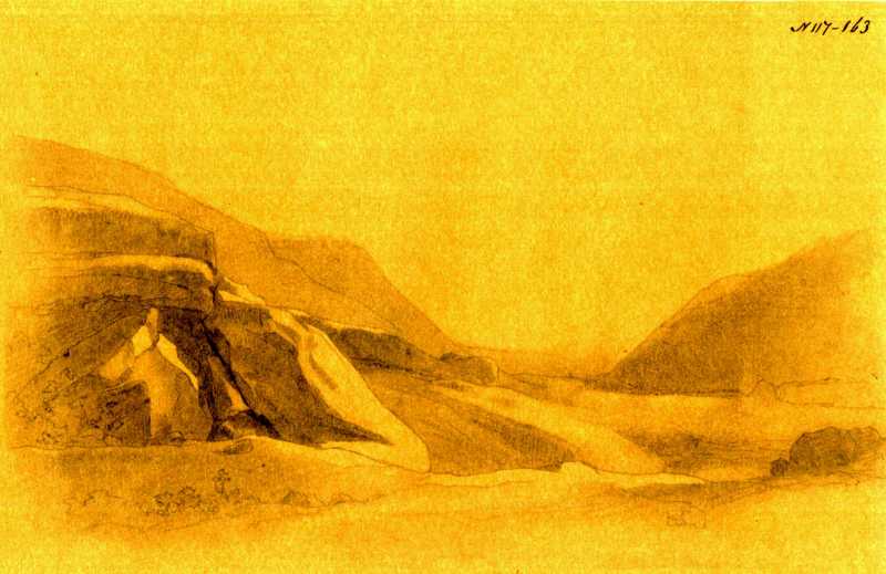 Т.Г.Шевченко. Скелі. Кольоровий папір, олівець, білило (14,7 × 22,5 см). [21.V – Не пізніше 6.IX 1851]. Державний музей Т. Г. Шевченка АН УРСР, Київ, інв. № г – 742.