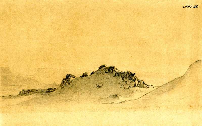 Т.Г.Шевченко. Кам'янистий горб. Тонований папір, олівець (15,2 × 23,8 см). [21.V – Не пізніше 6.IX 1851]. Державний музей Т. Г. Шевченка АН УРСР, Київ, інв. № г – 472.