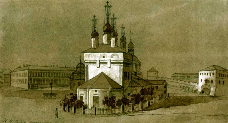 «Старинные нижегородские церкви меня просто очаровали. Они так милы, так гармонически пестры, и отвратительная погода не дает мне рисовать их. Я, однако ж, сегодня перехитрил упрямую погоду. Рано поутру пошел в трактир, спросил себе чаю и нарисовал из окна Благовещенский собор. Древнейшая в Нижнем церковь».