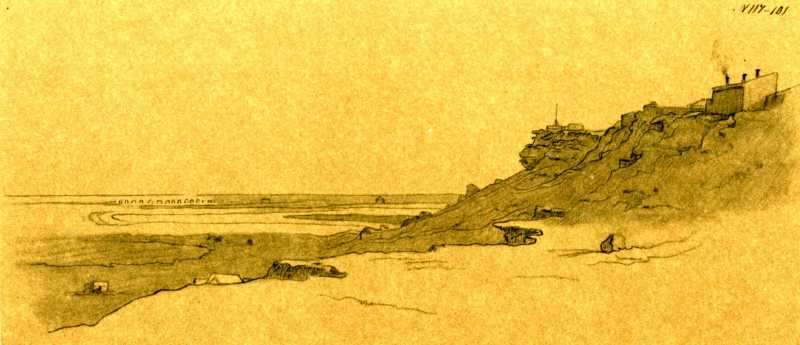 Т.Г.Шевченко. Флагшток Новопетровское укрепление и вид на станицу Николаевскую. Тонированная бумага, карандаш (12,6 × 28,5 см). [Новопетровское укрепление]. [1851 – VII 1857]. Государственный музей Т. Г. Шевченко АН УССР, Киев, инв. № г – 549.