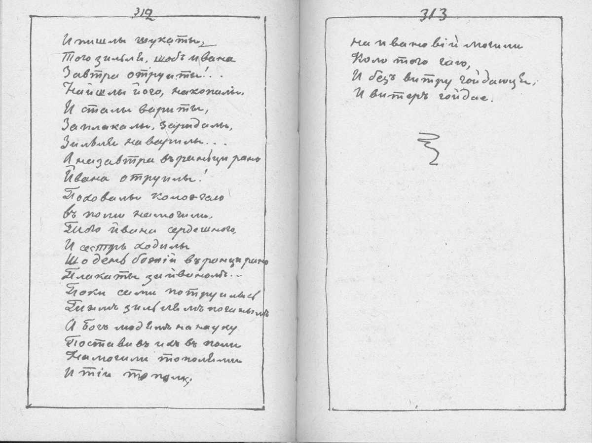 С. 312 – 313 І пішли шукати…«Мала книжка» Тараса Шевченка. С. 312 – 313 – закінчення поезії «Коло гаю в чистім полі…» з рядка «І пішли шукати…» |