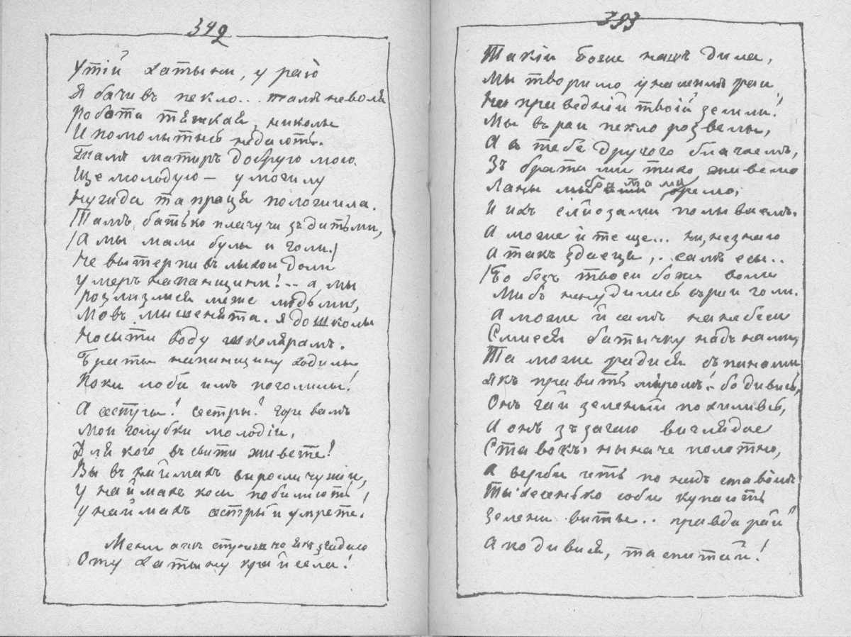 «Мала книжка» Тараса Шевченка. С. 392 – 393 – продовження поезії «Якби ви знали, паничі…» з рядка «У тій хатині, у раю…»