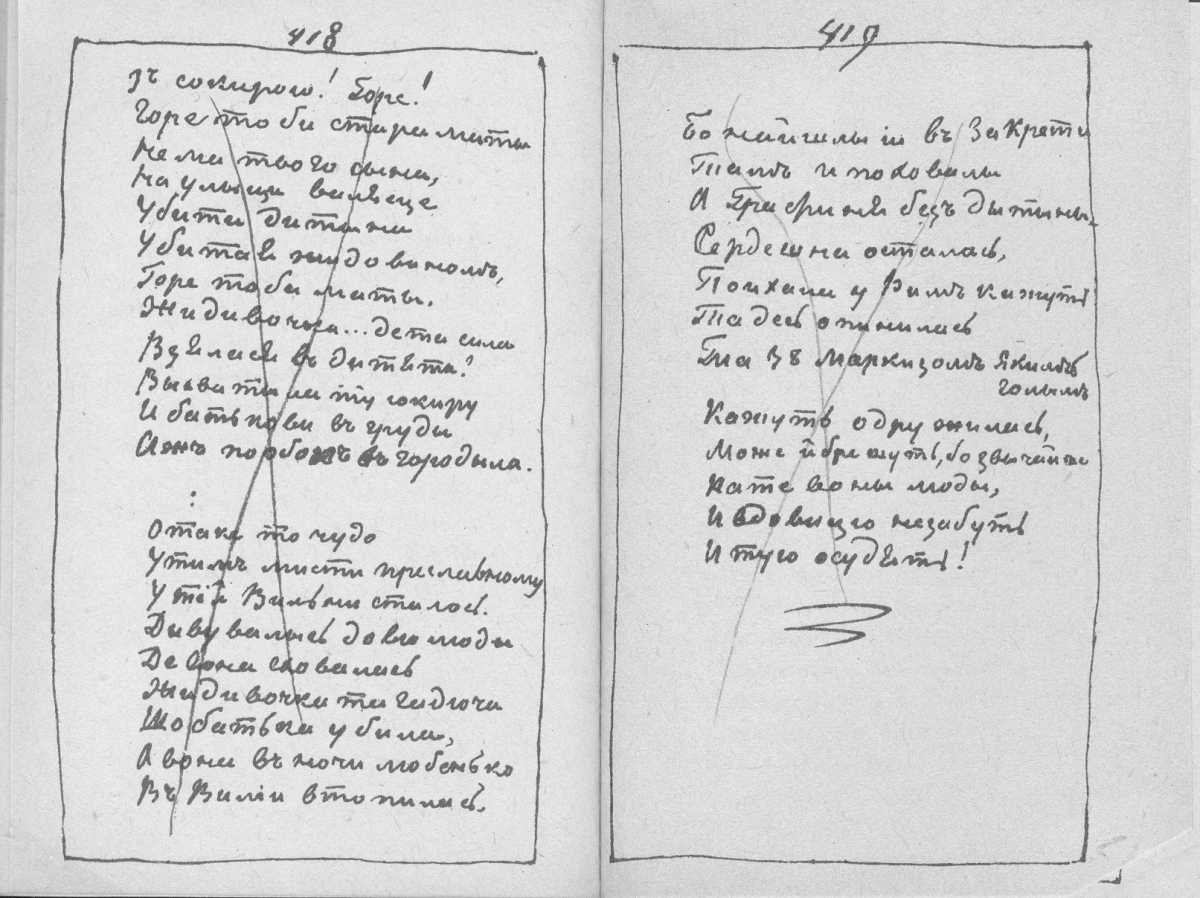 С. 418 – 419 З сокирою! Горе…«Мала книжка» Тараса Шевченка. С. 418 – 419 – закінчення поезії «У Вільні, городі преславнім…» з рядка «З сокирою! Горе…» |