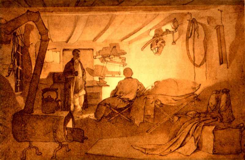Т.Г.Шевченко. О. Бутаков і фельдшер О. Істомін під час зимівлі на Кос-Аралі. Папір, сепія (18 × 27,3 см). [Кос-Арал]. [20.ХІ 1848 – 6.V 1849]. Державний музей Т. Г. Шевченка АН УРСР, Київ, інв. № г – 758.