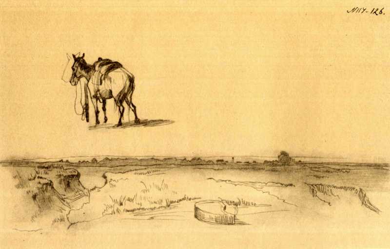 Т.Г.Шевченко. Селище серед степу. Кінь. Ескізні начерки. Папір, олівець (14,8 × 23 см). [VI 1848 – X 1849]. Державний музей Т. Г. Шевченка АН УРСР, Київ, інв. № г – 458.