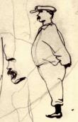 На аркуші в різних місцях і напрямках два начерки композиції до малюнка 1848 – 1849 рр. «Казахи в юрті» (див. № 14, 56), три автопортретні шаржовані постаті та два профілі, з яких один автопортретний. Аналогічний начерк постаті олівцем закреслено.