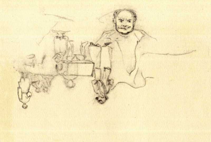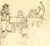 Жанрову сцену – музики (бубнист, катеринщик) і дитина, за ними на другому плані троє селян – дано обернено до зображення чоловічої голови. Датується часом перебування на Україні до першого арешту.