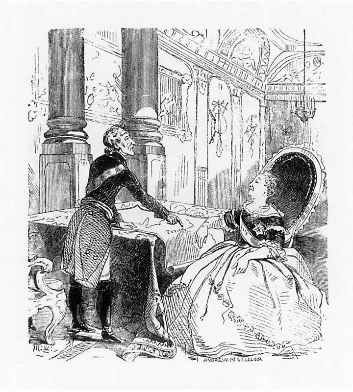 Ілюстрація до тексту на сторінках 200 – 201 книжки, де йдеться про обговорення Суворовим та Катериною II європейських справ, зокрема французької революції, що загрожувала європейським монархіям. Розроблявся план наступу Росії на Францію. На карті, розкладеній перед царицею, Суворов указує на напис: «Paris».